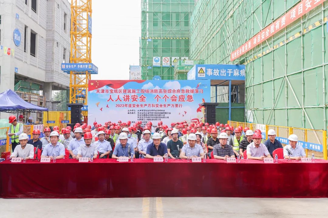 6月20日,天津市宝坻区2023年“安全生产月”建筑施工现场消防高坠综合应急救援演习观摩会在建工集团华北公司宝坻京津中关村科技城配套基础设施项目举办。