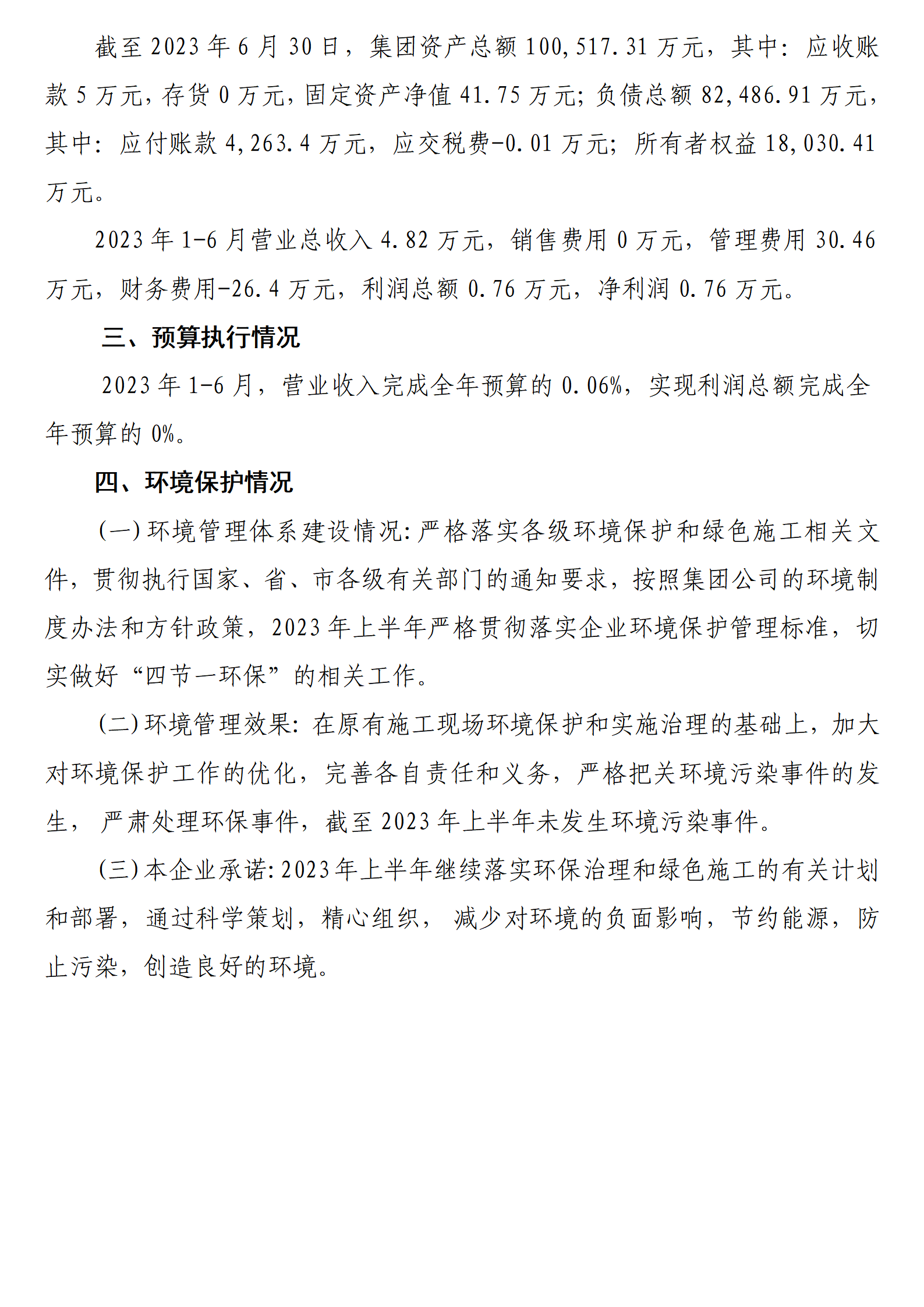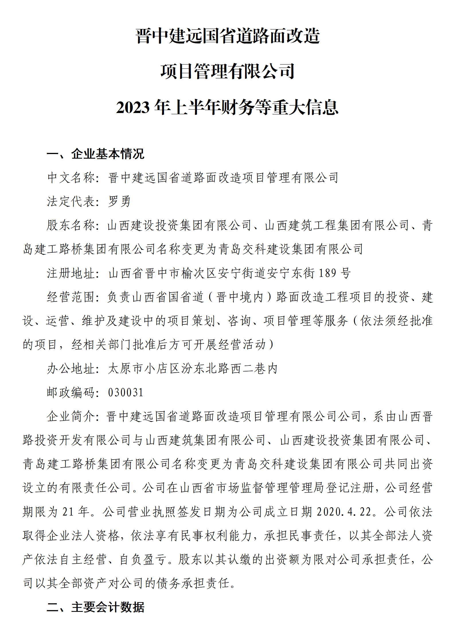 晋中建远国省道路面改造项目管理有限公司2023年上半年财务等重大信息