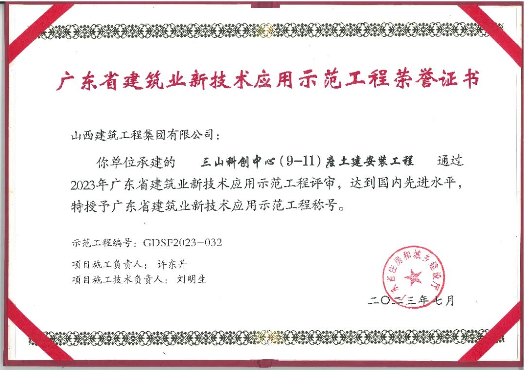 近日,由建工集团华南公司承建的三山科创中心(9-11)座土建安装工程荣获2023年度“广东省建筑业新技术应用示范工程”。这是建工集团在广东省首次斩获省级奖项,为今后继续开拓广东市场打下坚实基础。