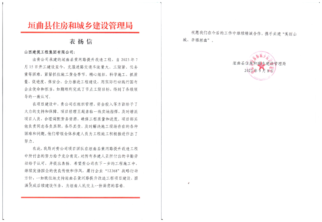 9月8日,由建工集团路桥工程公司承建的垣曲县黄河路提升改造工程收到垣曲县住房和城乡建设管理局的表扬信,垣曲县住房和城乡建设管理局对公司在工程建设过程中的高度重视、精心组织,科学施工及全力推进工程建设,表示充分肯定和赞扬。