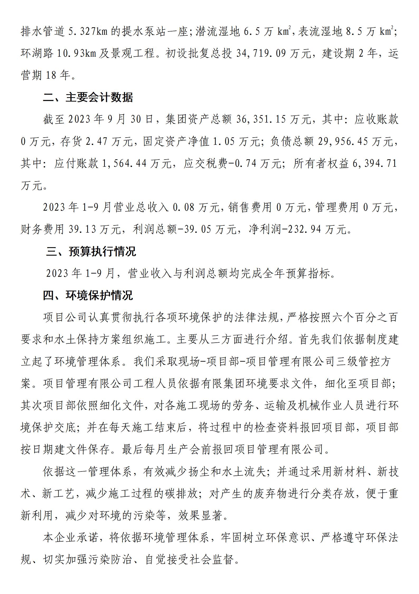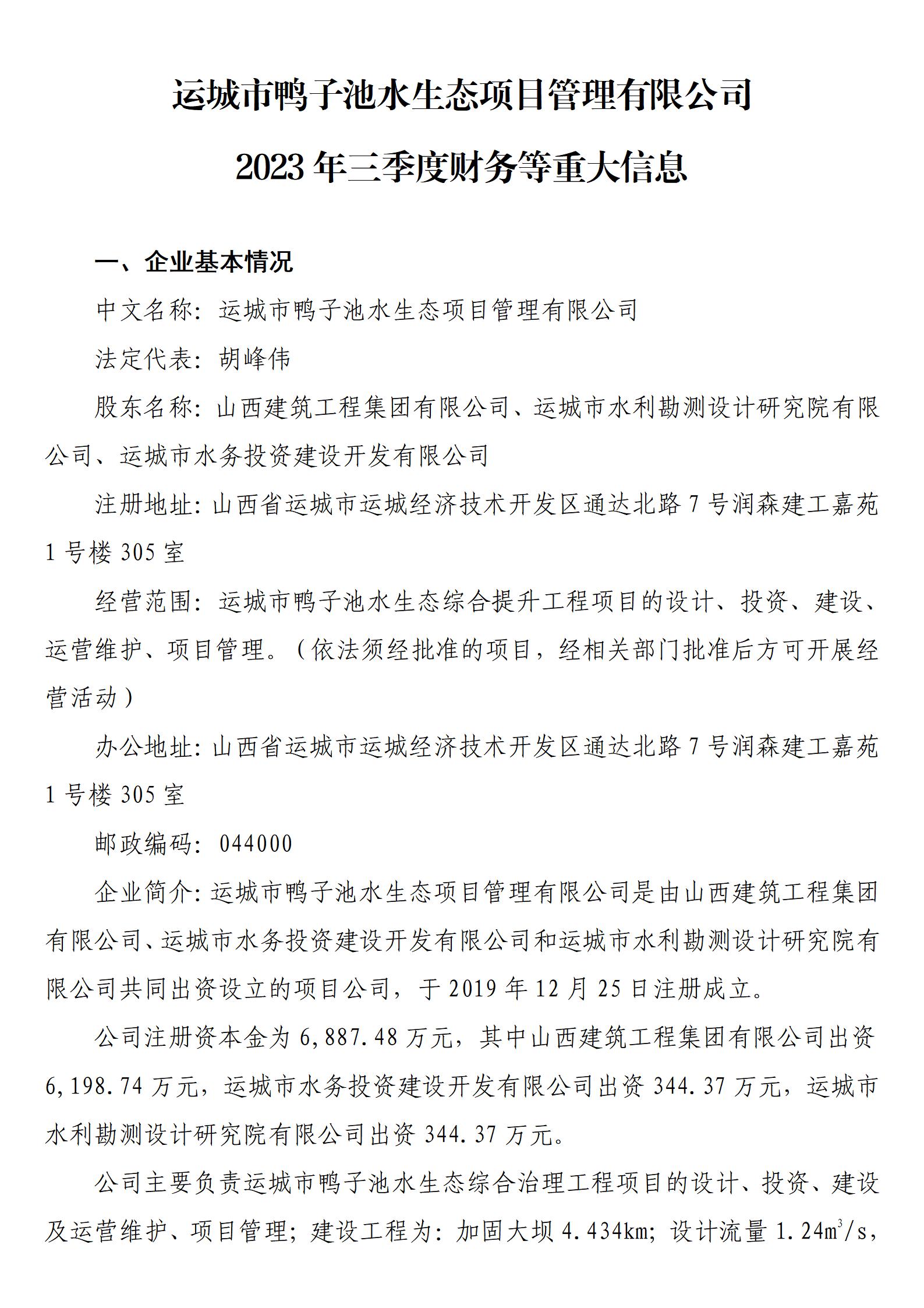运城市鸭子池水生态项目管理有限公司有限公司2023年三季度财务等重大信息
