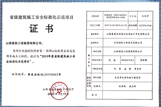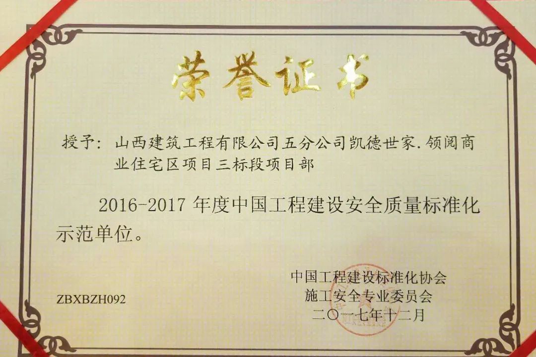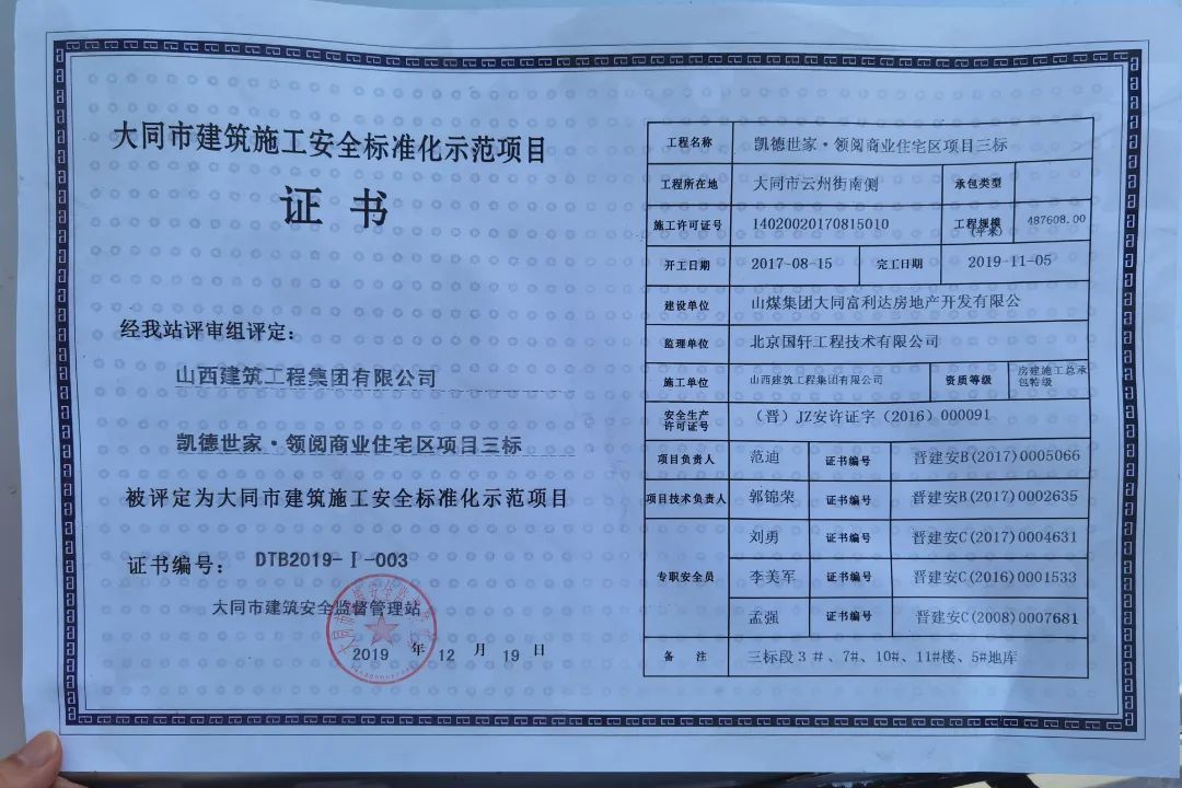 凯德世家·领阅商业住宅区项目荣获“2016-2017年度中国工程建设安全质量标准化示范单位”,项目QC成果“提高铝模拉片系统混凝土一次合格率”荣获“2018年度山西省工程建设施工企业优秀QC小组三等奖”“2018年度山西建设投资集团有限公司优秀QC小组二等奖”。此外,项目还被评为“2019年度省级建筑施工安全标准化示范项目”“大同市建筑施工安全标准化示范项目”。领阅·太和道商业住宅项目荣获“2021年中国安全产业建筑行业安全生产标准化项目”称号。文华住宅项目于今年7月提前实现主体封顶,获得业主方高度称赞。