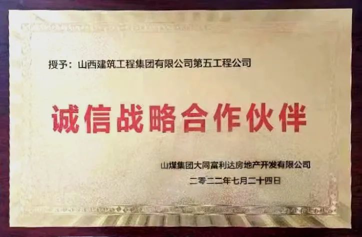 近日,山西建投建工集团第五工程公司被山煤集团大同富利达房地产开发有限公司授予“诚信战略合作伙伴”称号,并予颁发奖牌。这一荣誉的取得,是集团公司在精益建造上不断发力,在优质履约上奋勇争先,从而被合作伙伴充分肯定的具体体现。
