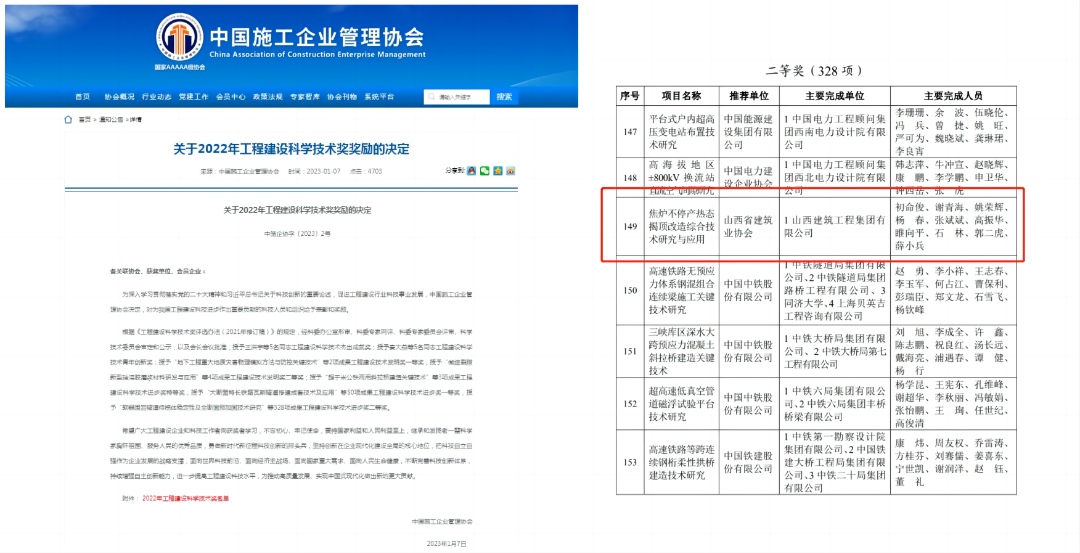 近日,山西建投建工集团科研项目《焦炉不停产热态揭顶改造综合技术研究与应用》荣获中国施工企业管理协会“工程建设科学技术进步奖”二等奖,在山西省建筑业协会提名推荐的3个获奖项目中排名第一。