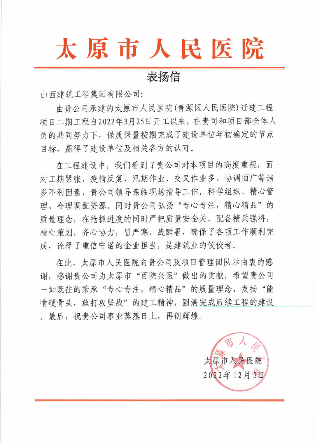 近日,山西建投建工集团太原市人民医院(晋源区人民医院)迁建工程项目部收到一封来自建设单位太原市人民医院的表扬信,信中对集团公司在项目建设过程中高度重视、科学管理、保证质量、攻坚克难、全速推进工程建设表达了由衷的感谢。表扬信情真意切,字里行间充盈着对建工人辛勤付出、努力耕耘和重信守诺的认可。