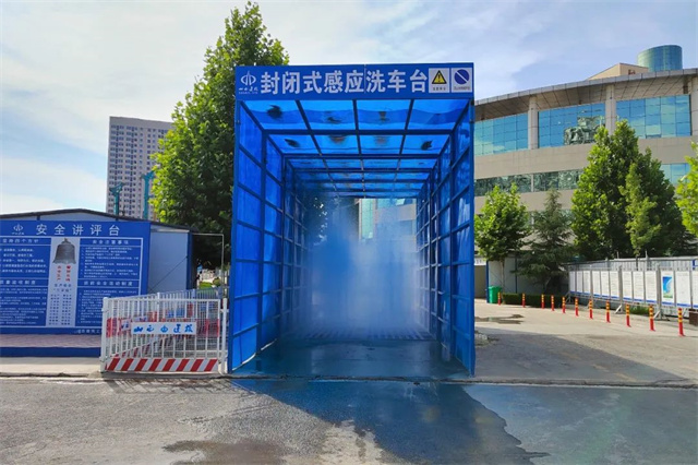 施工现场设有喷淋降尘设施,对场地进行绿化降尘。为保证出入工地现场的车辆不污染市政道路,在现场出入口设置了车辆冲洗装置,外出车辆需冲洗干净后方可驶离施工场地,冲洗后的水被收集到废水沉淀池,循环使用。