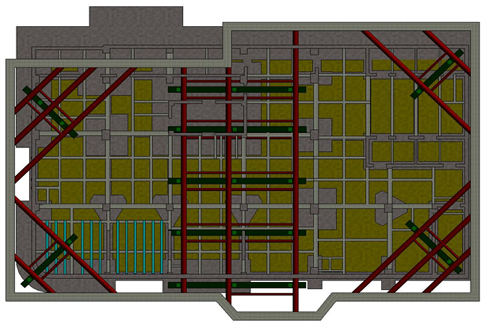 如何解决结构碰撞问题?——合理运用BIM技术。基础结构与基坑内支撑杆件交叉部位多,施工工序复杂,在工程前期阶段,通过BIM技术明确内支撑与地下结构的位置关系,一般构件精确留设预留洞口,重要构件与设计洽商换撑施工,提前规避了施工过程中技术问题。