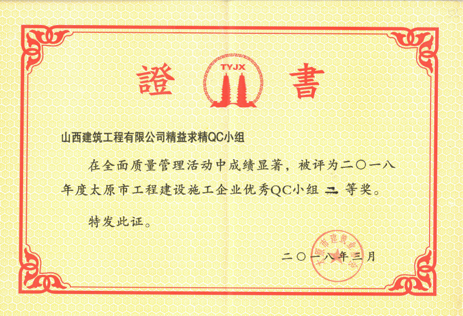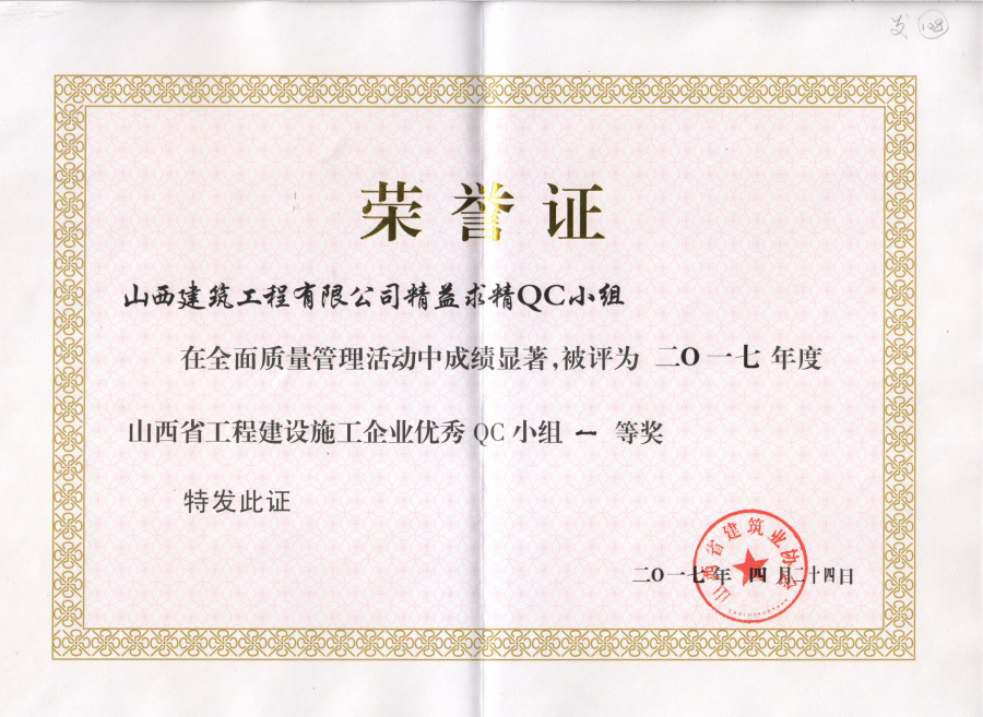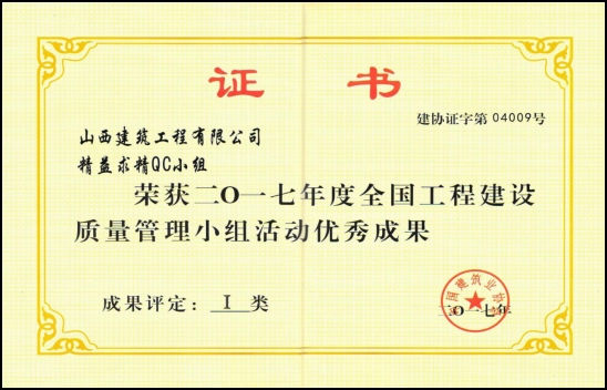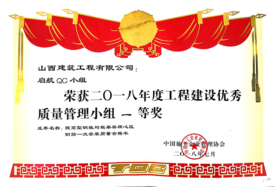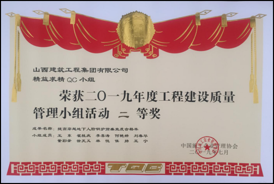 取得六项QC成果,其中《提高深基坑内支撑与剪力墙节点施工质量合格率》荣获中建协一等奖,《提高型钢柱与框架梁核心区钢筋安装一次合格率》荣获中施协一等奖,《提高穿越地下人防钢护筒垂直度合格率》荣获中施协二等奖。