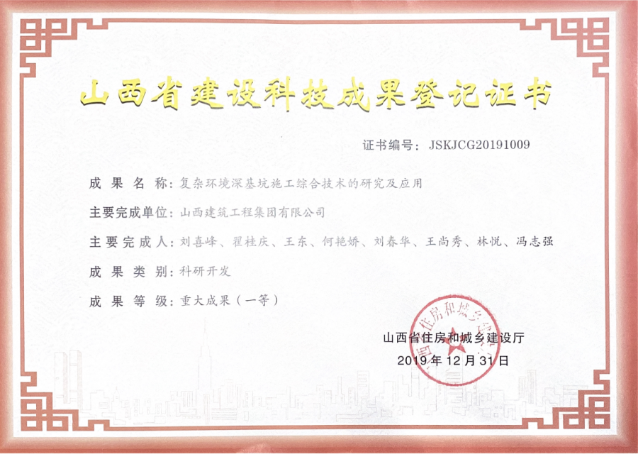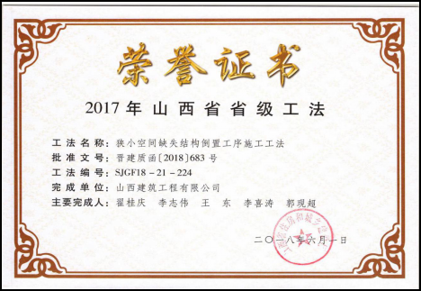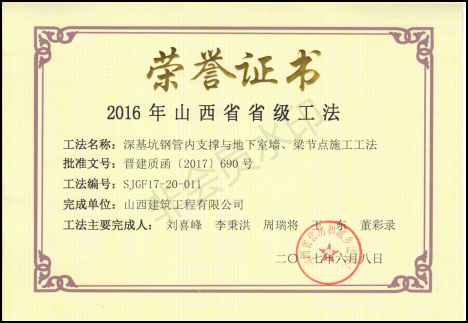 取得四项省级工法:深基坑传力杆式内支撑转换施工工法;狭小空间缺失结构倒置工序施工工法;狭小现场深基坑肥槽回填施工工法;深基坑钢管内支撑与地下室墙、梁节点施工工法。