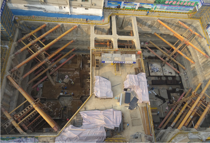 地下施工如何保证安全?——采用综合基坑支撑形式。根据基坑周边不具备正常放坡和支护条件的狭小场地现状,经过专家论证、设计优化后项目部确定基坑周圈采用钢筋砼灌注桩支护,内部支护形式采用工具式组合内支撑,四角采用四道钢管角支撑支护,中间采用钢筋砼梁板结构栈桥对撑和三道钢管对撑技术,水平支撑范围内设置28道竖向钢柱支撑,形成牢固可靠的安全支护体系。