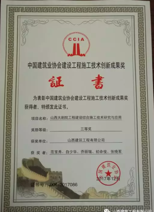 会上,由公司实施的“山西大剧院工程建设综合施工技术研究与应用”科研成果以其独特技术创新优势荣获了2017年中国建筑业协会建设工程施工技术创新成果奖三等奖。