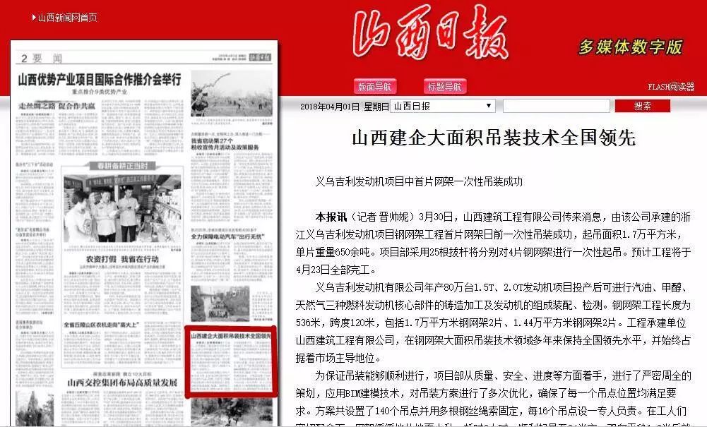 《山西日报》4月1日第2版报道公司钢网架大面积吊装技术(原题:山西建企大面积吊装技术全国领先),再次凸显行业领先地位。