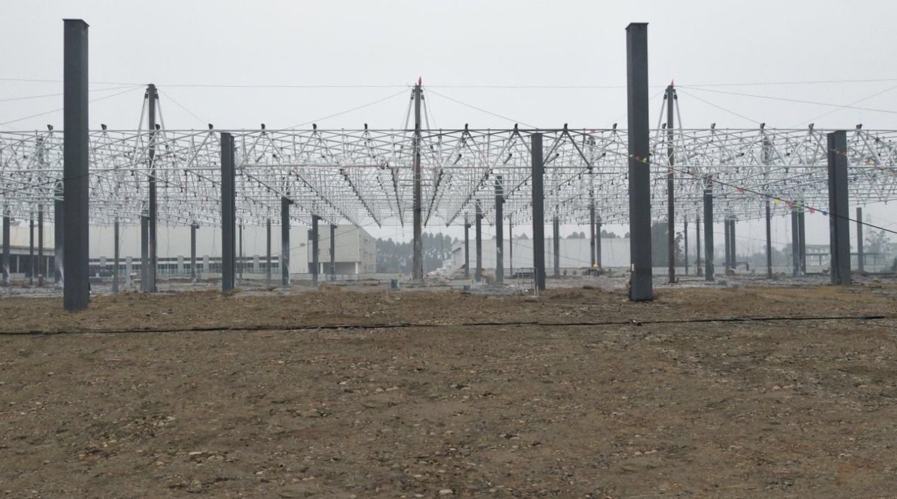 义乌吉利发动机有限公司年产80万台1.5T、2.0T发动机项目,投产后可进行汽油、甲醇、天然气三种燃料发动机核心部件的铸造加工及发动机的组成装配、检测。其钢网架工程长度为536米,跨度120米,总面积约65000平方米,包括17000平方米钢网架2片、14400平方米钢网架2片。项目部运用“拔杆群整体吊装”技术,采用25根拔杆分别对4片钢网架进行一次性起吊。预计工程将于4月23日全部完工。