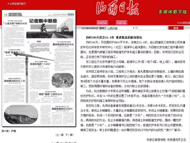 历时240天,开挖面积约4600平方米,深度达31.4米,由山西建筑工程有限公司承建的中石化科学技术研究中心(北区)能源中心超深基坑,为目前北京在施工程中最深的基坑,也是国内房建工程采用桩锚支护体系施工最深的基坑。目前,该项目已经安全见底,正在进行地下结构的施工。