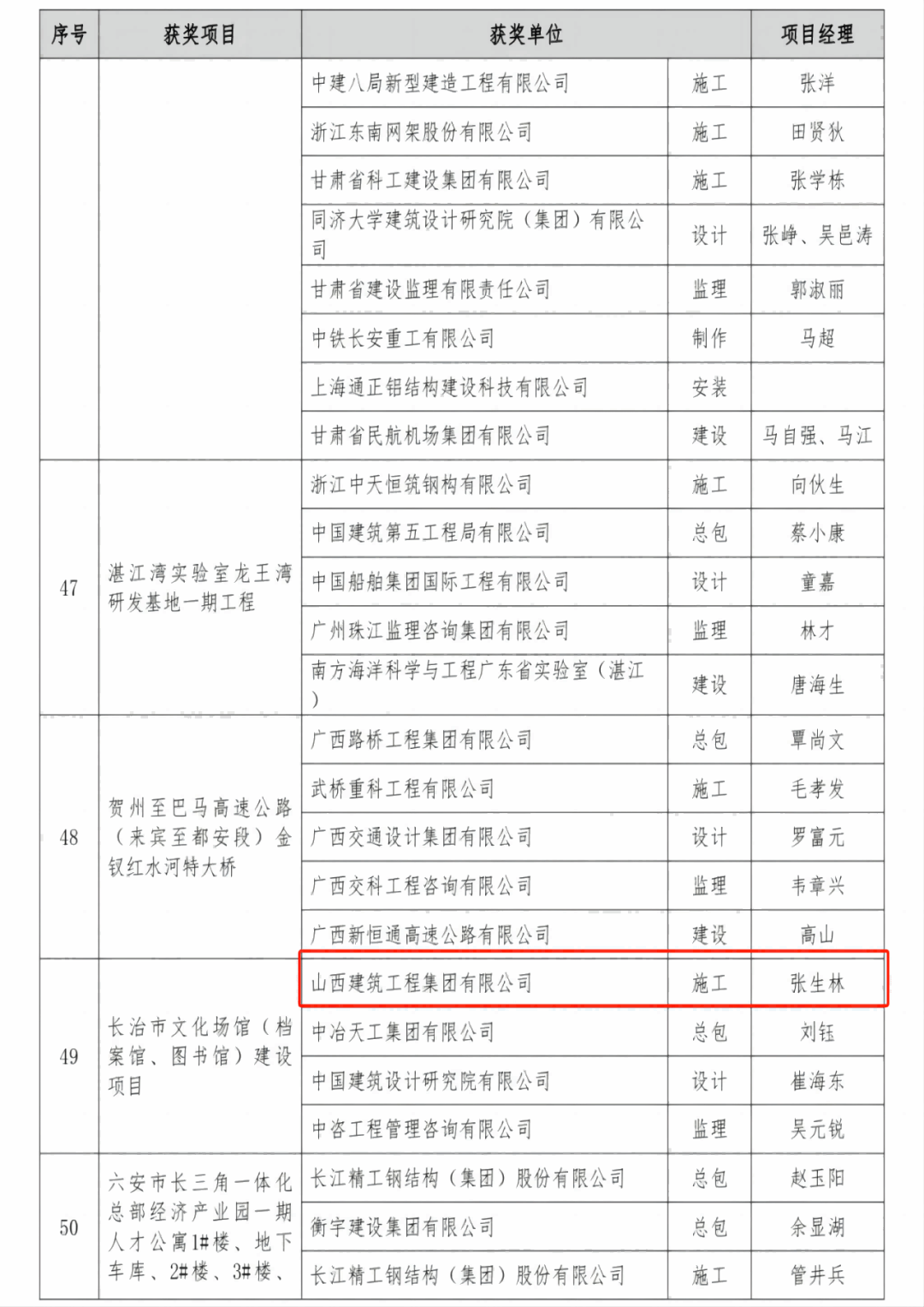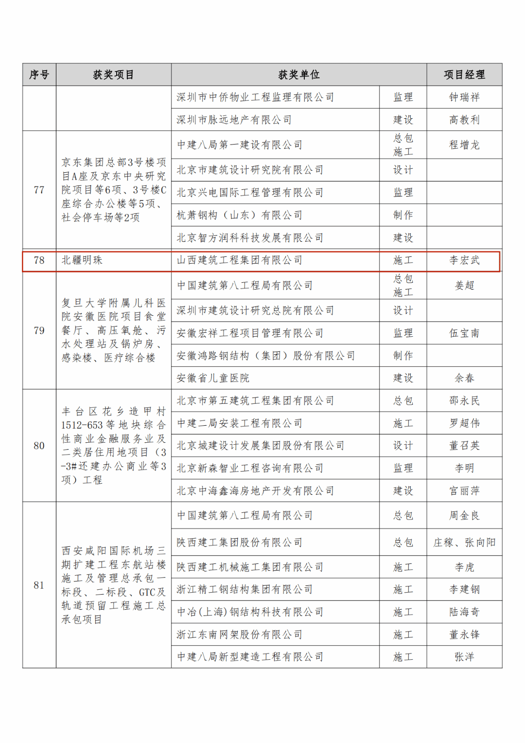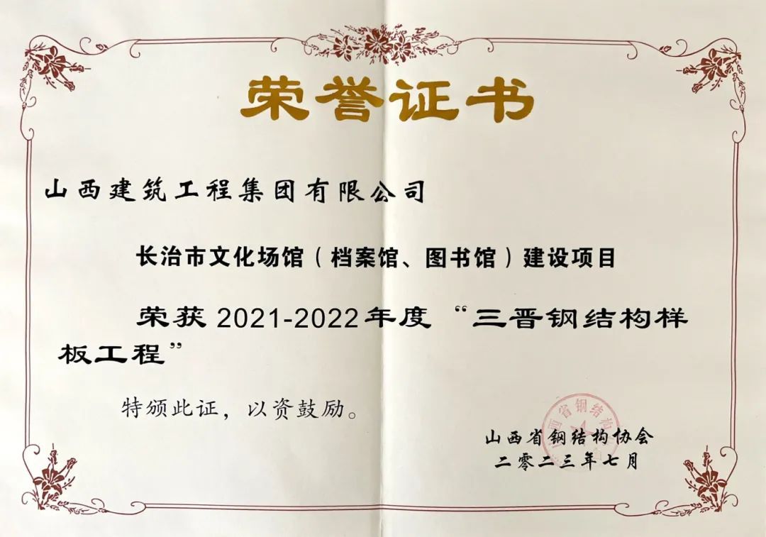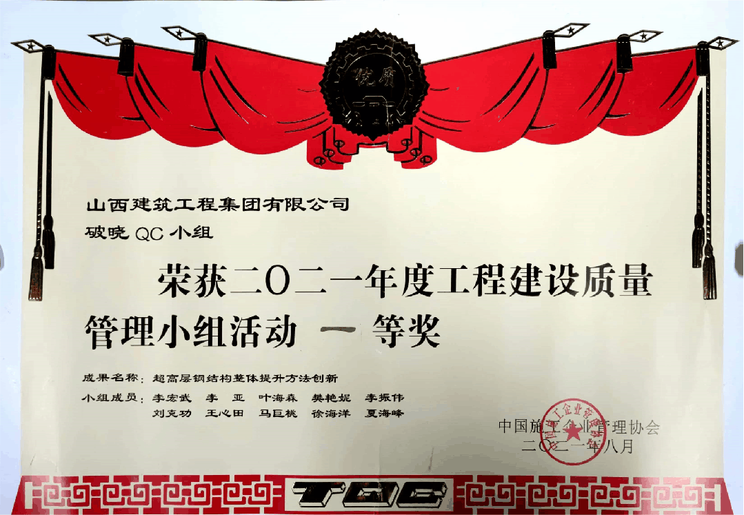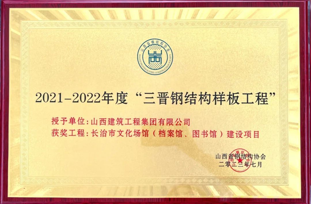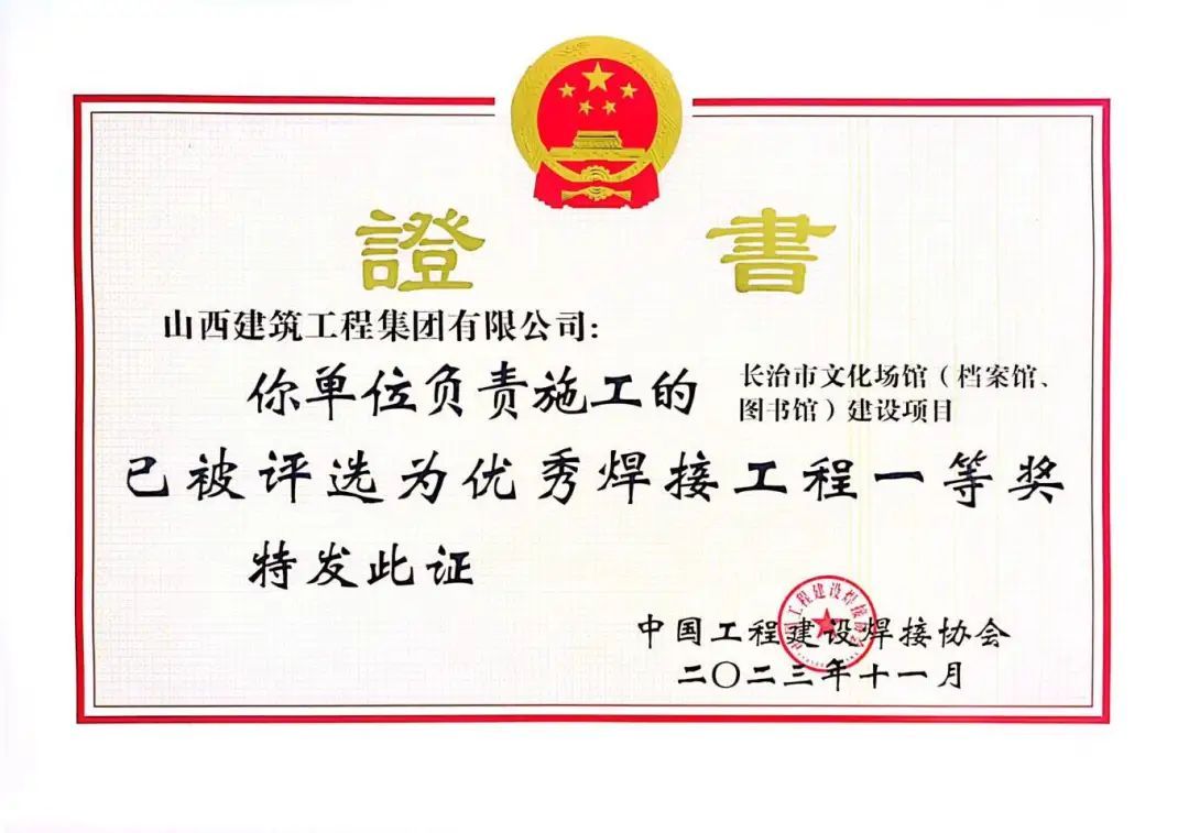 该项目先后授权发明专利1项、实用新型专利3项;荣获了“中国工程建设焊接协会优秀焊接工程一等奖”、“三晋钢结构样板工程”、中国建筑业协会钢木建筑分会I类质量小组成果1项、山西省质量信得过班组1项、企业级工法1项等多项荣誉。