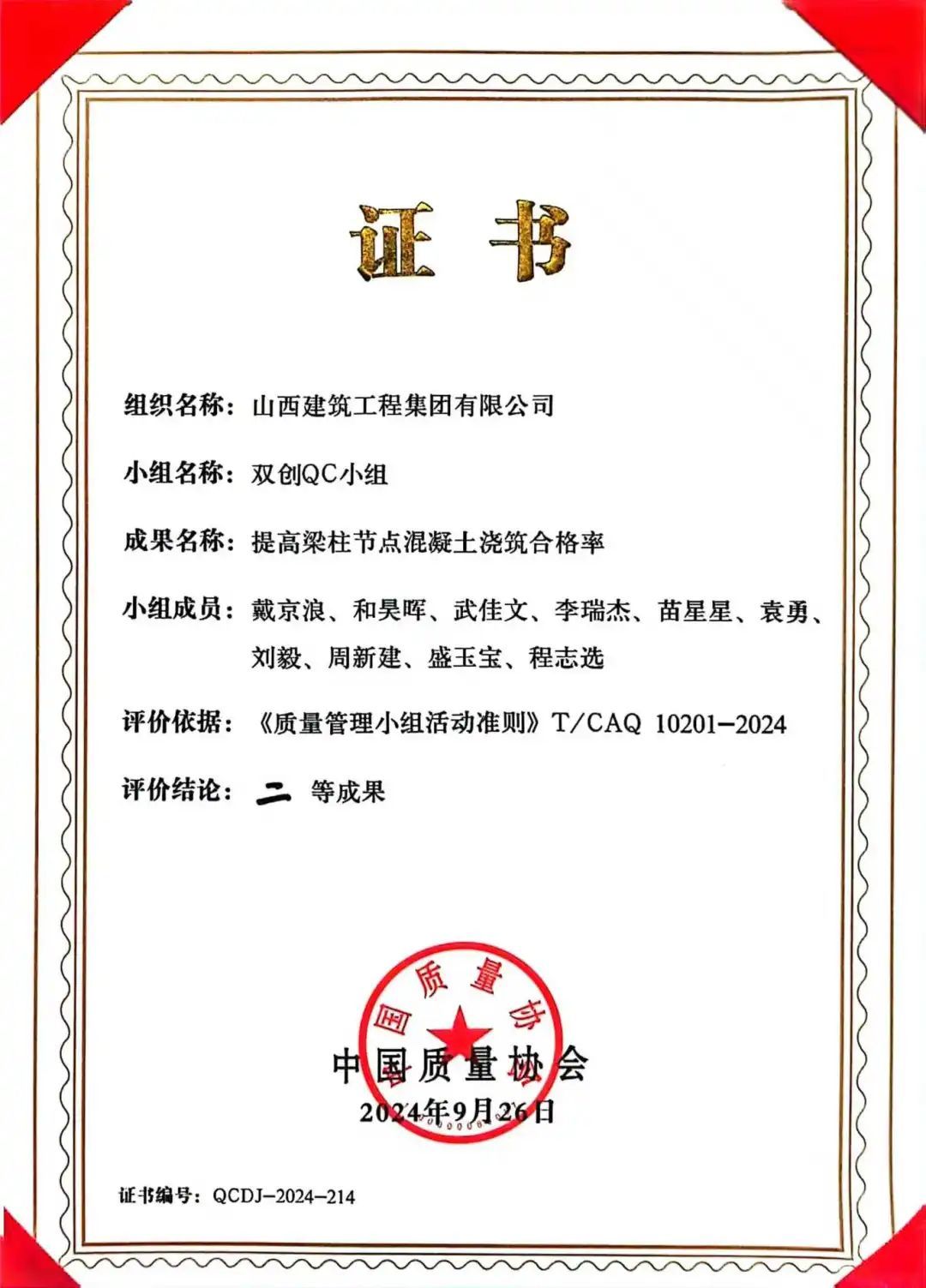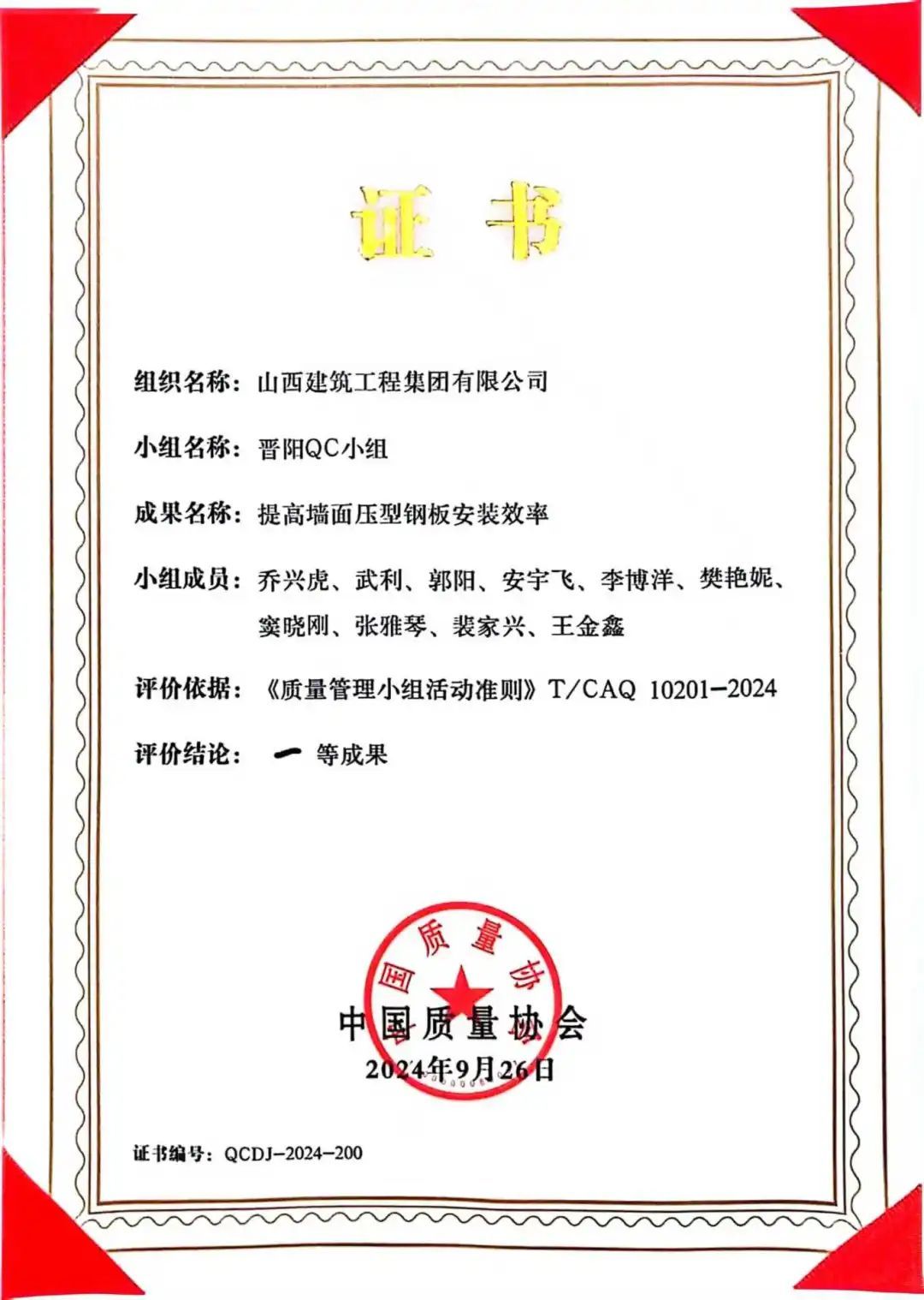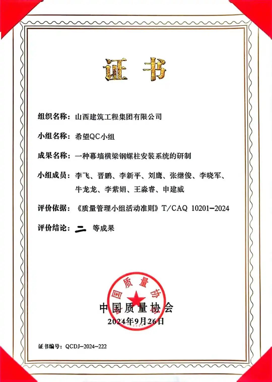 9月24-26日,中国质量协会“全国第46次质量管理小组代表会议暨全国质量信得过班组建设典型经验交流大会”在烟台召开。经过全国各行业优秀成果激烈比拼,山西建投建工集团首获全国质量管理小组“一等成果”1项(第四工程公司晋阳QC小组)、“二等成果”2项(装饰公司希望QC小组、西北公司双创QC小组),全国质量信得过班组“四星级班组”1项(劳务公司劳务管理班组),也是省内唯一一家获此殊荣的建筑企业。
