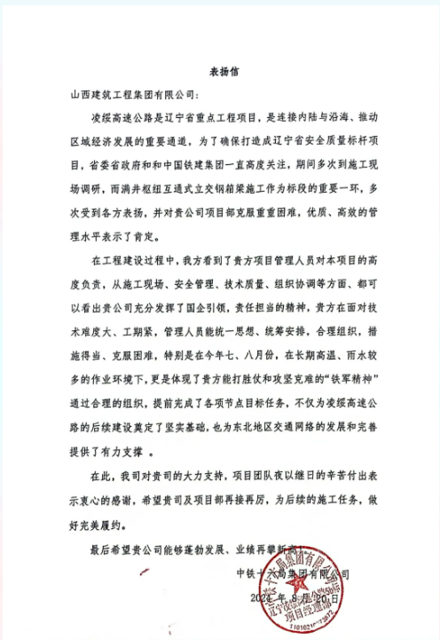 近日,辽宁凌绥高速公路5b标项目收到中铁十六局集团的表扬信,信中对项目团队通过合理组织,提前完成各项节点目标任务,表示肯定和赞扬。