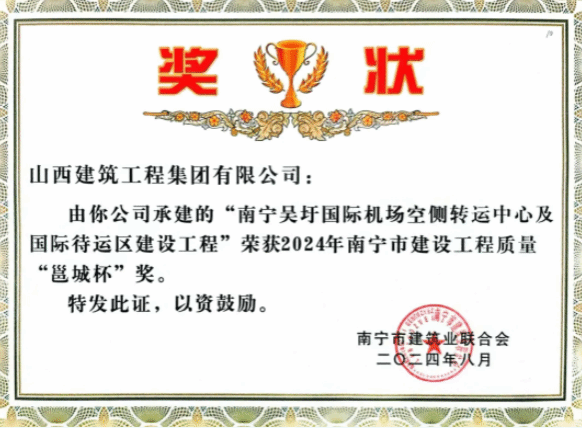 近日,南宁吴圩国际机场空侧转运中心及国际待运区建设工程荣获南宁市建设工程质量“邕城杯”奖。南宁市建设工程质量“邕城杯”奖是南宁市建设工程质量最高荣誉奖,由南宁市建筑业联合会组织实施,评选结束向社会公示拟获奖工程名单,接受社会监督,最终获奖结果报南宁市住房和城乡建设局备案。