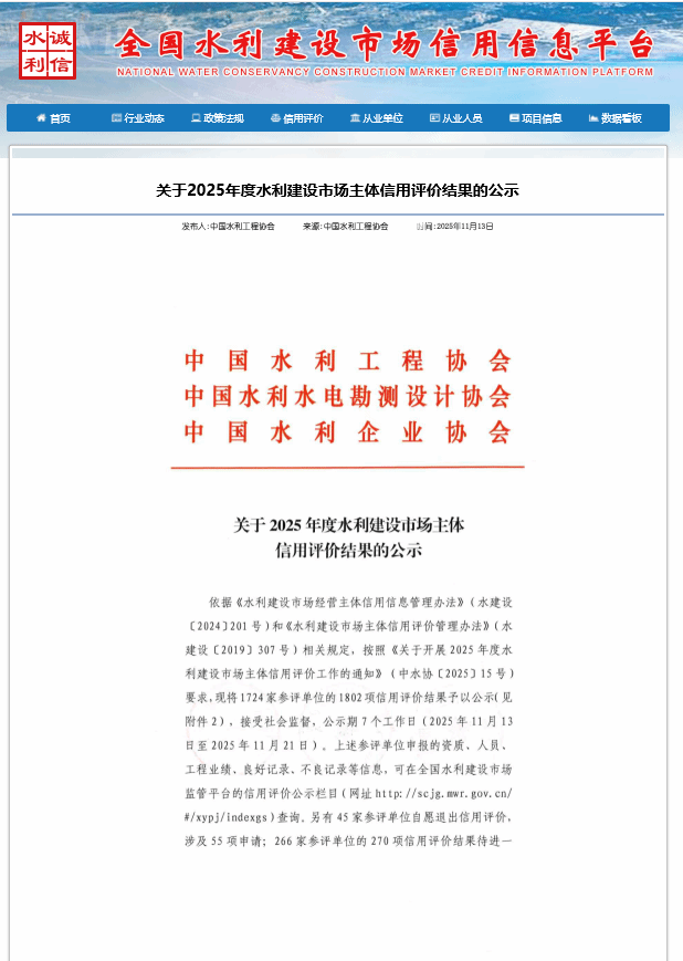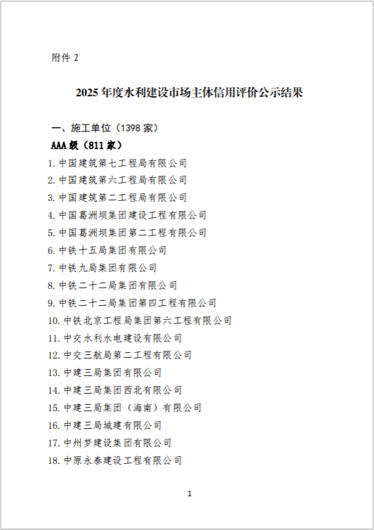 近日,中国水利工程协会发布了《关于2025年度水利建设市场主体信用评价结果的公示》,山西建投建工集团成功获评2025年度水利建设市场主体信用评价AAA级(最高级)。