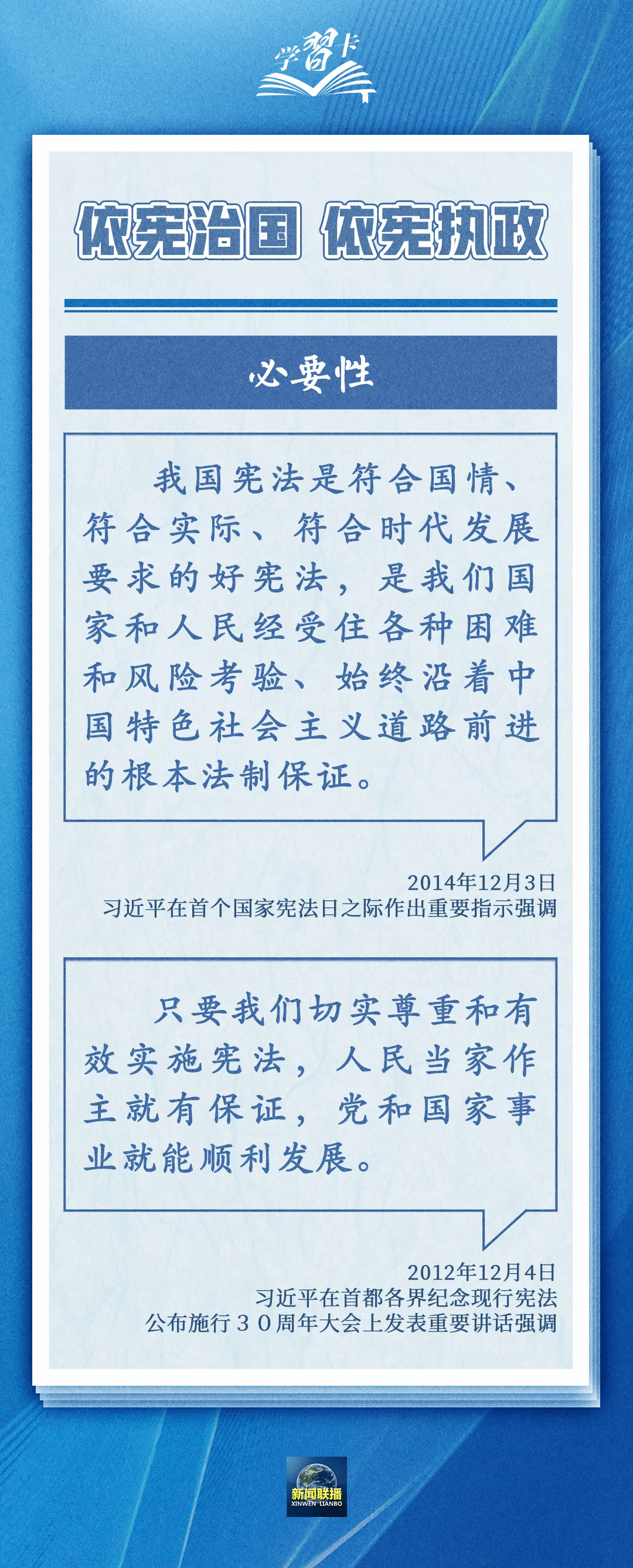 围绕依宪治国、依宪执政,习近平总书记多次在不同场合强调,宪法是党和人民意志的集中体现,丰富和发展了中国特色社会主义法治理论,也为推进国家治理体系和治理能力现代化指明了根本路径和努力方向。一起学习——