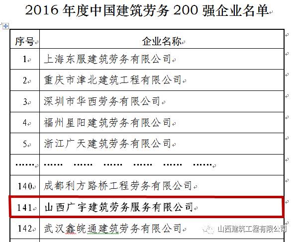 近日,中国建筑业协会发文公布了2016年度中国建筑劳务200强企业名单。我公司广宇劳务公司(全称:山西广宇建筑劳务服务有限公司)从全国7000余家劳务分包企业中脱颖而出,入选为2016年度中国建筑劳务200强企业,荣列第141位!