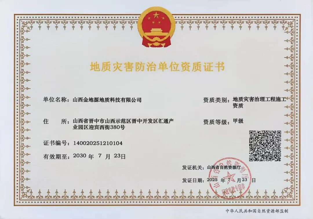 载誉前行,创新不止。山西金地源地质科技有限公司将以此次再认定为新起点,持续深耕地质灾害治理、生态修复与土地整治核心领域,加大研发投入,深化协同合作,全力打造行业创新发展标杆,以技术创新助力区域生态环境改善与资源循环利用,为地质科技行业高质量发展贡献更大力量。
