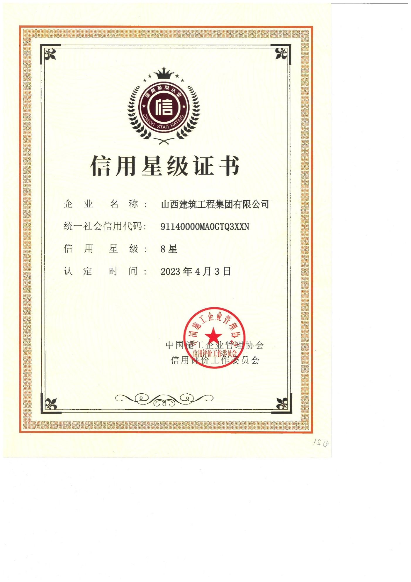 中国施工企业8星信用星级证书